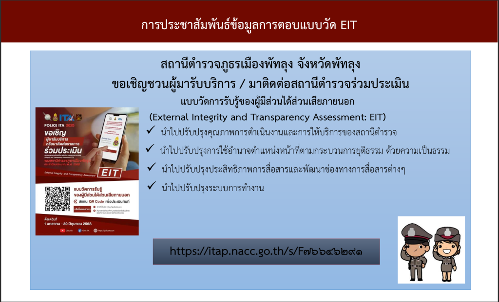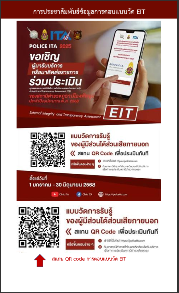 ผู้มารับบริการหรือมาติดต่อราชการร่วมประเมินคุณธรรมและความโปร่งใส่ในการดำเนินการงานของภาครัฐ (Integrity and Transpraency Assessment : ITA)ของสถานี่ ตำรวจภูธรเมืองพัทลุงประจำปีงบประมาณ 2568 เพียงท่านสแกน QR-Code เพื่อประเมิน ทันที่ หรือเข้าไปที่เว็ปไชด์ https://itap.nacc.go.th แล้วค้นหาสถานี่ตำรวจที่ท่านเคยติดต่อราชการเพื่อประเมินสถานี่โดยตรง หรือกดลิงค์ https://itap.nacc.go.th/s/F76646291