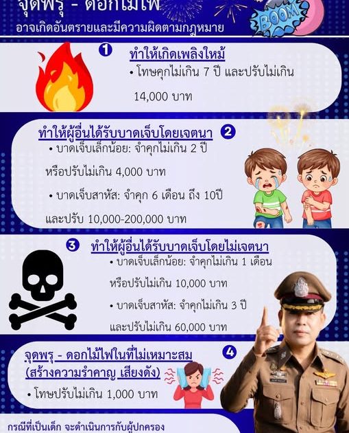 จุดพรุ ดอกไม้ไฟ ทำให้เกิดเพลิงไหม้ ทำให้ผู้อื่นได้รับบาดเจ็บโดยเจตนา หรือบาดเจ็บโดยไม่เจตนา , จุดพรุ ดอกไม้ไฟในที่ไม่เหมาะสม โทษตามรายละเอียด