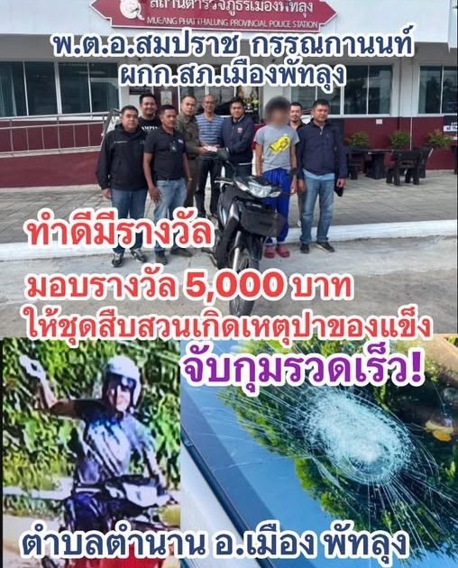 พ.ต.อ.สมปราช กรรณกานนท์ผกก.สภ.เมืองพัทลุง มอบรางวัลให้ ชุดสืบสวน 5,000 บาท จับรวดเร็ว ลดความเดือดร้อนให้ประชาชนในทันที สั่งการพนักงานสอบสวน ให้ดำเนินการทุกคดี เหตุผู้กระทำผิดปาของแข็งใส่รถของประชาชนที่ขับขี่ในพื้นที่ตำบลตำนาน อ.เมือง พัทลุง ผู้กำกับปราช ทราบ ได้สั่งให้ชุดสืบสวนติดต่อจับกุมทันที ผู้กระทำผิดอายุ 27 ปี เครียดจากการถูกออกจากงาน ก่อเหตุดังกล่าว สารภาพทำมา 12 ครั้ง