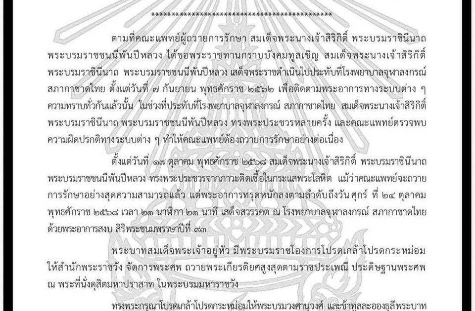 ประกาศ สมเด็จพระนางเจ้าสิริกิติ์ พระบรมราชินีนาถ พระบรมราชชนนีพันปีหลวงสวรรคต