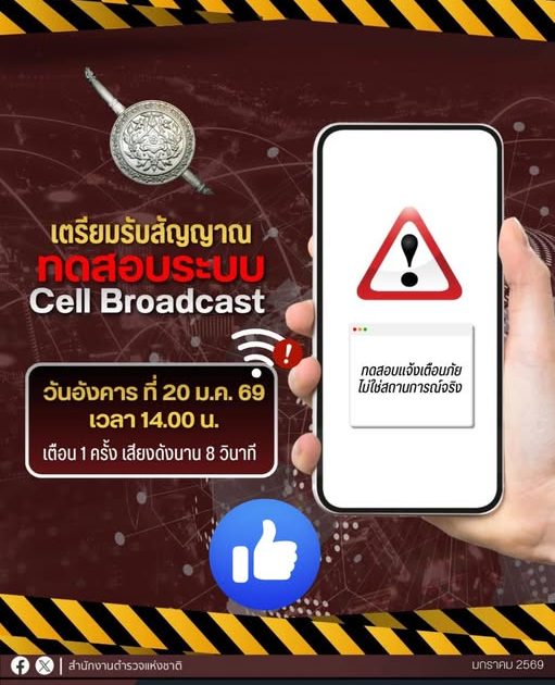 พรุ่งนี้ บ่าย 2 โมง ทดสอบระบบเตือนภัย Cell Broadcast ทั่วประเทศ