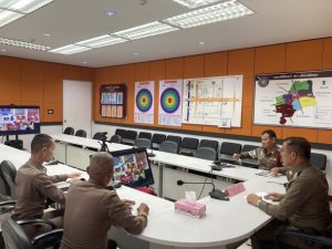 และเจ้าหน้าที่ผู้เกี่ยวข้องร่วมเฝ้าฟังการประชุมเคลื่อนงานจราจร และเตรียมความพร้อมการป้องกันและลดอุบัติเหตุทางถนนและการอำนวยความสะดวกการจราจรช่วงเทศกาลปีใหม่ประจำปี 2569 ตร. เผ่านระบบ Video Conference ณ ห้องประชุม ศปก.สภ.เมืองพัทลุง