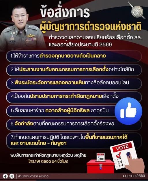 เลือกตั้ง สส.2569 ข้อสั่งการ พล.ต.อ.กิตติ์รัฐ พันธุ์เพ็ชร์ ผู้บัญชาการตำรวจแห่งชาติ กำชับ “ตำรวจ” ดูแลความปลอดภัย สงบเรียบร้อยการเลือกตั้ง สส. และออกเสียงประชามติ 2569