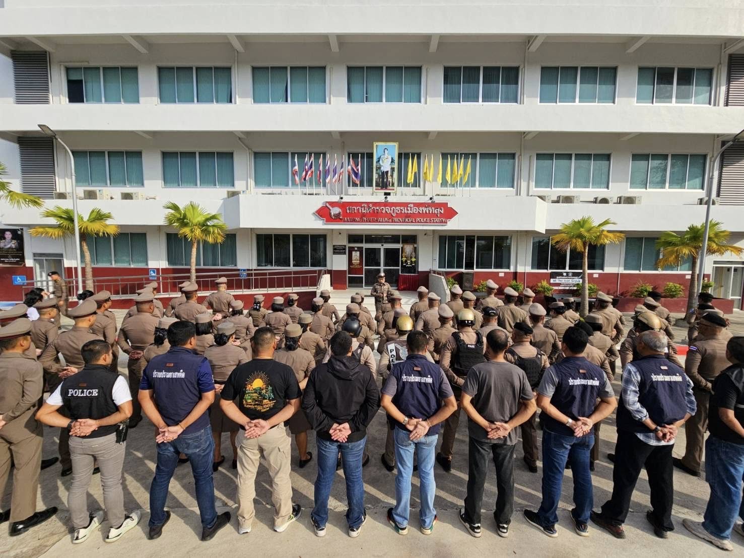 ตำรวจเมืองพัทลุงพร้อมปฏิบัติทุกภารกิจ พัทลุงปลอดภัยสงยสุข วันที่ 19 มกราคม พ.ศ.2569 เวลา 08.30 น. – พ.ต.อ.สมปราช กรรณกานนท์ ผกก.สภ.เมืองพัทลุง – พ.ต.ท.ฮากีม หมัดอาด้ำ รอง ผกก.ป.สภ.เมืองพัทลุง – พ.ต.ท.สุพัฒ ทองเขียว รอง ผกก.(สอบสวน) ภ.จว.พัทลุง ปฏิบัติราชการ รอง ผกก.(สอบสวน) สภ.เมืองพัทลุง – พ.ต.ท.อพิเชษฐ์ อุทยารักษ์ รอง ผกก.สส. สภ.เมืองพัทลุง – พ.ต.ท.สุทิน แดงช่วง สว.สส.สภ.เมืองพัทลุง – พ.ต.ท.กิตติพงศ์ วัชรจิตรกุล สว.จร.สภ.เมืองพัทลุง – พ.ต.ท.วิจิตร เกื้อรุ่ง สว.(สอบสวน) สภ.เมืองพัทลุง – พ.ต.ท.หญิง สิรตา เประนาม สว.อก.สภ.เมืองพัทลุง – พ.ต.ท.ปรเมศวร์ เกตุนิ่ม สวป.(ชส.)สภ.เมืองพัทลุง – พ.ต.ท.ณัฐศิษฏ์ ชูเพชร สวป.สภ.เมืองพัทลุง และข้าราชการตำรวจในสังกัดนักเรียนฝึกประสบการณ์ และนักเรียนนายสิบตำรวจ ร่วมลงแถว สวดมนต์ไหว้พระ กล่าวคำปฎิญาณตน กำชับการปฏิบัติหน้าที่ทุกสายงาน การแต่งกาย ทรงผม ตามระเบียบ ตร.