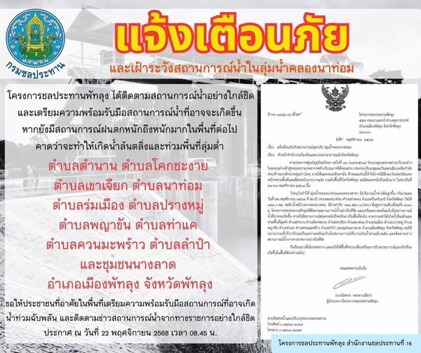 กรมชลประทาน แจ้งเตือนภัย เผ้าระวังสถานการณ์น้ำ ในลุ่มน้ำคลองนาท่อม อำเภอเมือง จังหวัดพัทลุง ร่วมกันสร้างสรรค์พัทลุงให้สงบสุข เมืองน่าเที่ยว กด Like กด แชร์ กดติดตาม ข่าวสาร เพื่อนกัน 24 ชั่วโมง สภ.เมืองพัทลุง ขอบคุณครับ