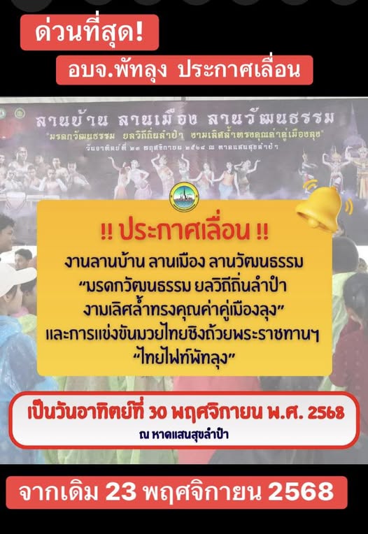 !ประกาศเลื่อน!การจัดงานลานบ้าน ลานเมือง ลานวัฒนธรรม “มรดกวัฒนธรรม ยลวิถีถิ่นลำปำ งามเลิศล้ำทรงคุณค่าคู่เมืองลุง”และการแข่งขันมวยไทยชิงถ้วยพระราชทานฯ “ไทยไฟท์พัทลุง” ที่จะจัดขึ้นในวันอาทิตย์นี้ เป็นวันอาทิตย์ที่ 30 พฤศจิกายน พ.ศ. 2568 ณ หาดแสนสุขลำปำ เนื่องจากสถานการณ์ฝนตกหนัก น้ำท่วม