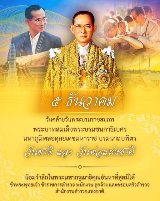๕ ธันวาคม ๒๕๖๘ วันคล้ายวันพระบรมราชสมภพ พระบาทสมเด็จพระบรมชนกาธิเบศร มหาภูมิพลอดุลยเดชมหาราช บรมนาถบพิตร “วันชาติ” และ “วันพ่อแห่งชาติ” น้อมรำลึกในพระมหากรุณาธิคุณอันหาที่สุดมิได้ ข้าพระพุทธเจ้า ข้าราชการตำรวจ พนักงาน ลูกจ้าง และครอบครัวตำรวจ สำนักงานตำรวจแห่งชาติ
