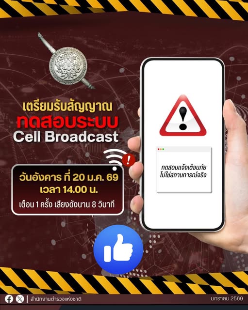 พรุ่งนี้ บ่าย 2 โมง ทดสอบระบบเตือนภัย Cell Broadcast ทั่วประเทศ กรมป้องกันและบรรเทาสาธารณภัย ทำการทดสอบระบบแจ้งเตือนภัยผ่านสัญญาณโทรศัพท์เคลื่อนที่ หรือ Cell Broadcast ไปยังโทรศัพท์เคลื่อนที่ “ทั่วประเทศ” ของผู้ใช้บริการผ่าน 3 เครือข่าย คือ NT TRUE AIS – สัญญาณเตือนภัยดังพร้อมกัน : วันอังคารที่ 20 มกราคม 2569 เวลา 14.00 น. . – ลักษณะการเตือน เตือน 1 ครั้ง เสียงดังนาน 8 วินาที พร้อมข้อความ Pop up บนหน้าจอโทรศัพท์มือถือ ” ทดสอบแจ้งเตือนภัย ไม่ใช่สถานการณ์จริง จากกรมป้องกันและบรรเทาสาธารณภัย (ปภ.) โปรดอย่าตื่นตระหนก This is a test message from Department of Disaster Prevention and Mitigation (DDPM), not real situation. No action required.” . – กรณีไม่ได้รับแจ้งเตือน ในกรณีปิดเครื่อง หรือ เปิดโหมดเครื่องบิน หรือ ใช้งาน Wi-Fi only หรือ เชื่อมต่อเครือข่าย 2G/3G หรือ โทรศัพท์มือถือไม่รองรับระบบแจ้งเตือน Cell Broadcast และผู้ที่อยู่นอกพื้นที่ทดสอบ #ทดสอบCellBroadcast #ระบบแจ้งเตือนภัย #สำนักงานตำรวจแห่งชาติ #RoyalThaiPolice